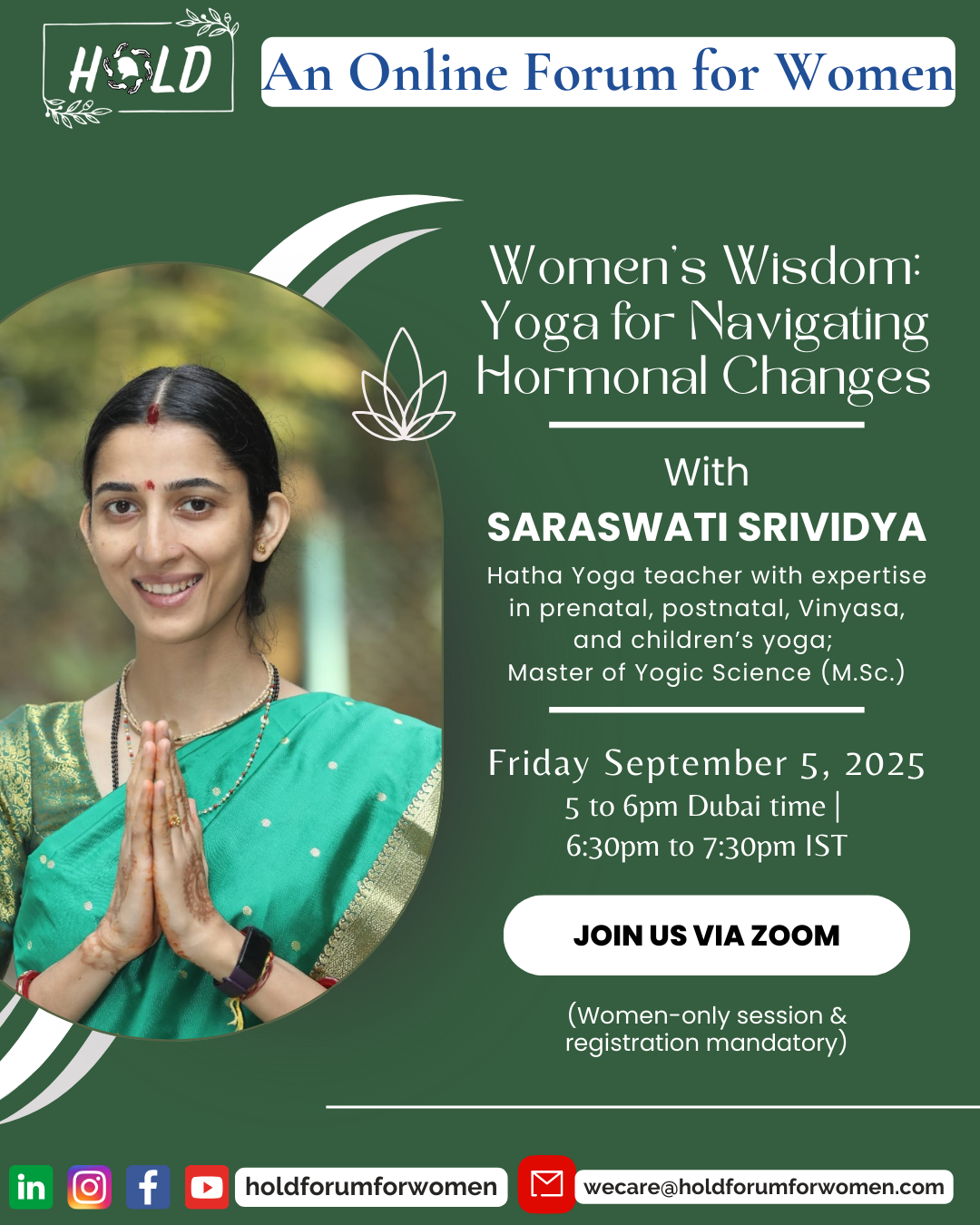 HOLD Forum for Women is delighted to invite Ms. Saraswati Srividya, a Hatha Yoga teacher with expertise in prenatal, postnatal, Vinyasa, and children’s yoga; Master of Yogic Science (M.Sc.) to join us for our upcoming session: "Women's Wisdom: Yoga for Navigating Hormonal Changes" Don’t miss this opportunity to meet and interact with our esteemed guest....